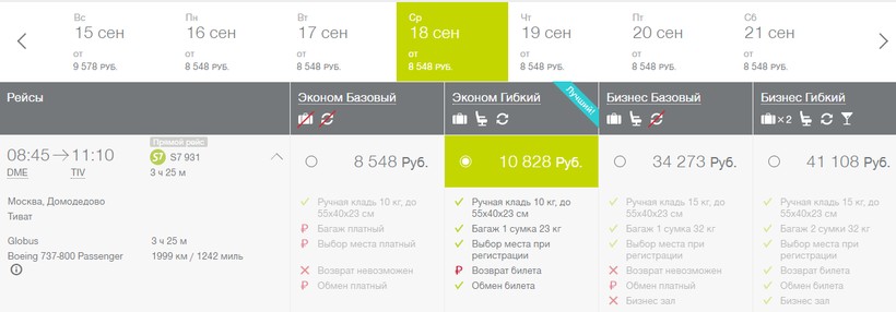 Цены действуют на вылеты с середины сентября по май, а в туристический сезон они возрастают примерно на 2500–5500 ₽ в одну сторону. Чтобы сэкономить у S7, советую опять же бронировать авиабилеты только с ручной кладью, тогда они будут дешевле примерно на 2500 ₽.
