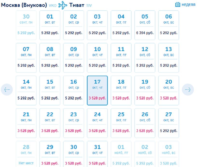 Хотя у Red Wings расписание полетов хуже, чем у «Уральских авиалиний» (с июня до октября по понедельникам, вторникам, четвергам, пятницам и воскресеньям), у авиакомпании также можно найти недорогие билеты — от 8000 ₽ в одну сторону.