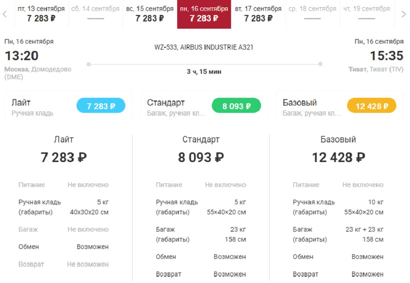 Для авиаперелета в Тиват из чартерных перевозчиков я выбираю «Уральские авиалинии», потому что рейсы ежедневные (с июля по октябрь), а цена невысокая — с багажом только туда можно купить от 7500 ₽.