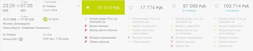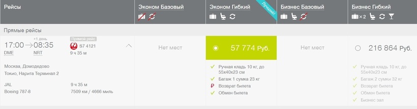 Что касается перелета с Japan Airlines, то это менее популярный вариант, потому что цены на авиабилеты не отличается своей демократичностью и начинаются с 58000 рублей. Стоимость билетов одинакова, что за неделю, что за пару месяцев до вылета (так что бронировать заранее, чтобы сэкономить нет смысла). Проездные вы можете оформить и на сайте S7. Где есть два тарифа — в «эконом» и в «бизнес». Вылеты ежедневно из Домодедово (самолет, на котором отправитесь — Boeing 787 Dreamliner, более современный и комфортабельный, чем у «Аэрофлота»). До воздушной гавани также рекомендую добираться на аэроэкспрессе от Павелецкого вокзала. Полчаса и вы на месте.