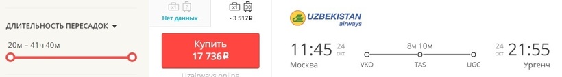 До этого узбекского города есть вариант долететь не только прямыми рейсами, но и стыковочными. Правда такое авиапутешествие по времени выйдет дольше (минимум 8 ч.). Вдобавок билеты стоят на 10–40% дороже, так что рассматривать это как более дешевый способ добраться до места не стоит. Им советую воспользоваться, если только время вылета прямого рейса вам не подходит или остался дорогой бизнес-класс.