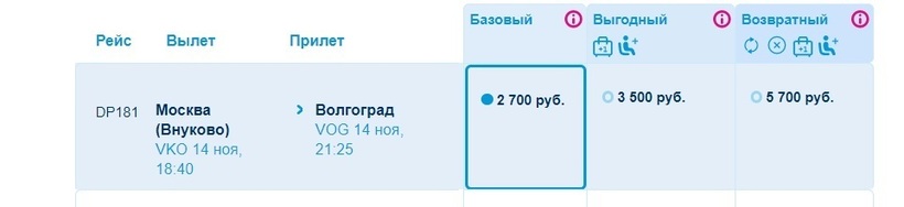 Победа (DP 6967) Boeing 737-800 | 18:55 Москва (SVO) | 2 ч. 00 мин | 20:55 Волгоград (VOG) | 10 октября |
