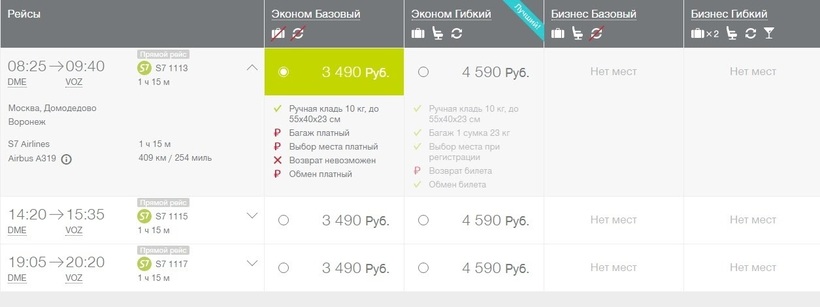 S7. Расписание у этого перевозчика вполне удобное. Есть три ежедневных рейса — утром, днем и вечером. Из-за стоимости билетов перелет с S7 более популярный вариант, чем с «Аэрофлотом». За пару дней до поездки авиабилет можно купить за 3500 рублей. Это примерно на 40% дешевле, чем у «Аэрофлота». Для экономии могу посоветовать бронировать полет только с ручной кладью (тариф «Базовый»), тогда цена будет минимальной, то есть 3500 рублей.