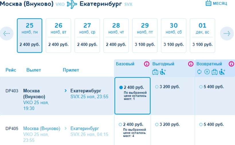 Победа (DP 403) Boeing 737-800 | 23:55 Москва (VKO) | 2 ч. 25 мин | 04:20 Екатеринбург (SVX) | 11, 13, 17, 18, 20, 22, 24, 25, 26, 27, 28, 29, 30, 31 октября, 1, 2, 3, 4, 5, 6 ноября, … |