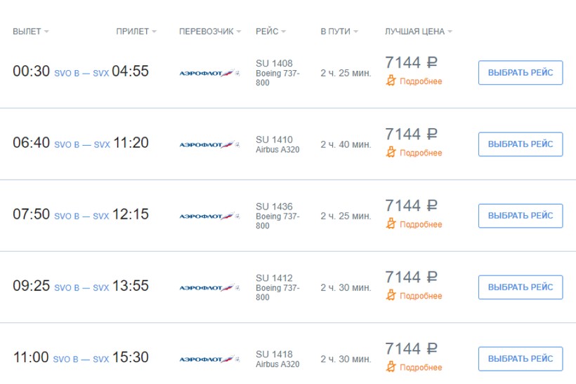 Аэрофлот (SU 1414) Airbus А320 | 17:40 Москва (SVO) | 2 ч. 30 мин | 22:10 Екатеринбург (SVX) | 27, 29, 30, 31 октября, 1, 3, 5, 6, 7, 8, 10, 12, 13, 14, 15, 17, 19, 20, 22, 24 ноября, … |