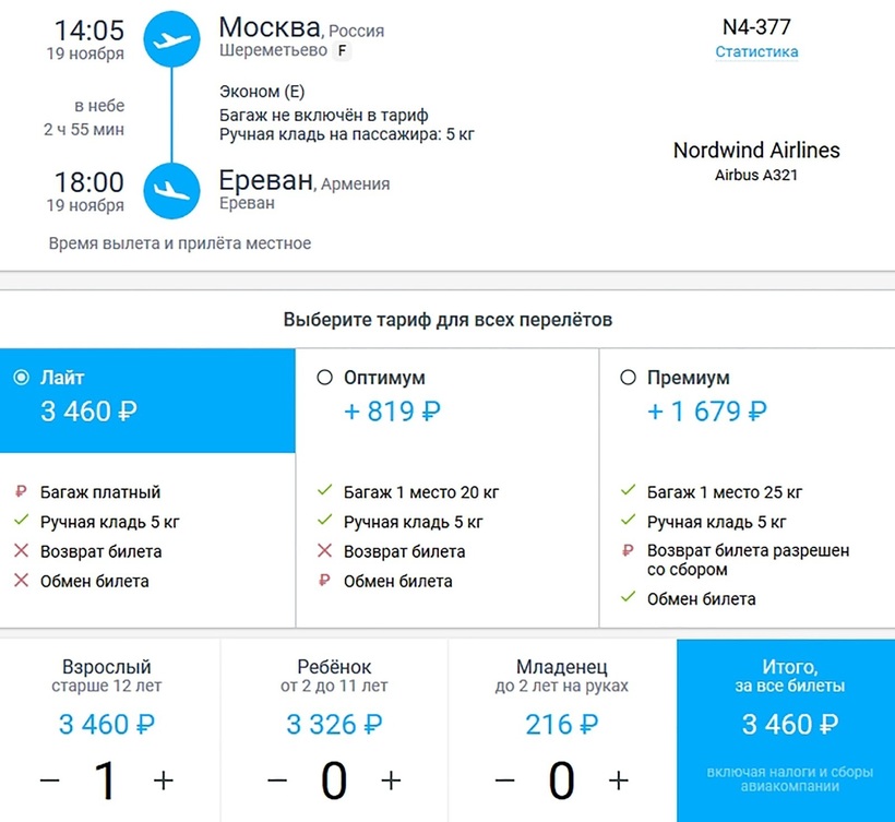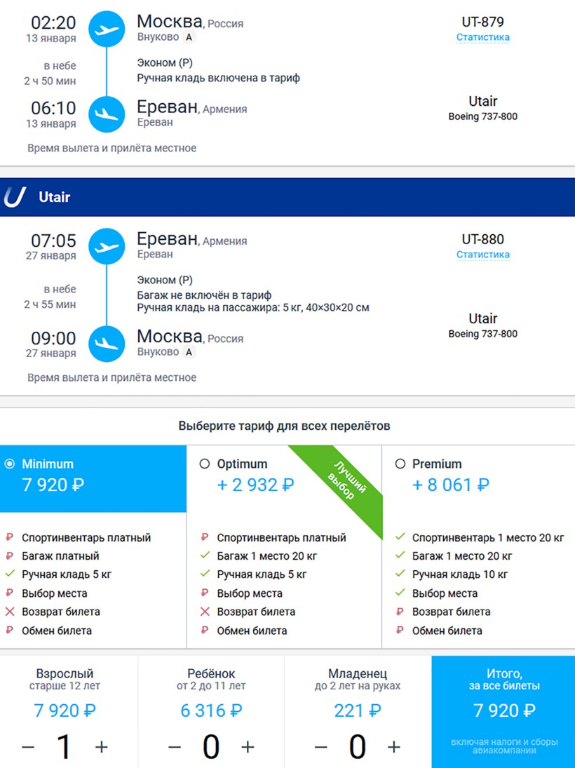 Можно найти вариант подешевле, но я предпочитаю летать с этой авиакомпанией. Дело в том, что у Utair одно из самых выгодных предложений перелета в обе стороны. Если купить (за 2,5 месяца) билет на обратный рейс в январе, то авиапутешествие Москва — Ереван — Москва обходится в 8000 ₽ только с ручной кладью на 5 кг (или 10500 рублей с чемоданом до 20 кг). Это на 1,5–2 тысячи ₽ дешевле, чем предложения других компаний.