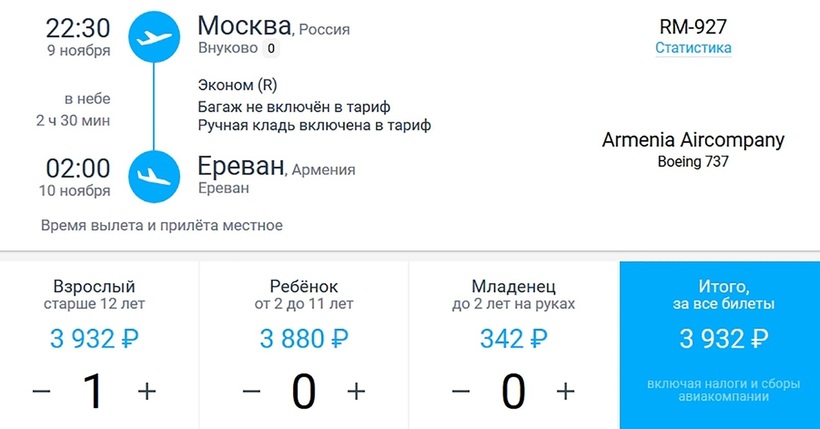 Национальный армянский перевозчик Armenia летает дважды в день из Внуково. Рейсы Armenia самые короткие — 2,5 часа. Если путешествовать по тарифу «Легкий» (в него входит только ручная кладь на 8 кг), то вы заплатите 3900 ₽, да еще и ранее бронирование не требуется, достаточно двух недель.