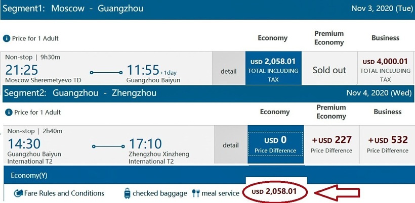 Российскую столицу и китайский Чжэнчжоу прямые авиарейсы не связывают, но по маршруту осуществляются транзитные перелеты. Преодолеть расстояние между городами с одной стыковкой можно круглый год только с компанией China Southern Airlines. Лайнеры оператора летают по направлению по понедельникам, вторникам, четвергам и субботам. Авиарейсы выполняются через Шэньчжэнь, Гуанчжоу или Урумчи, пересадка занимает 1,5–3,5 ч., все авиапутешествие длится 12,5–15 ч. Главный недостаток «Китайских Южных авиалиний» — очень дорогие билеты: в одну сторону с багажом стоят от 147000 ₽ (2058 $), туда-обратно — от 217500 ₽ (3040 $). Бизнес-класс — от 324000 ₽ (4532 $).
