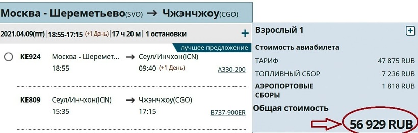 Korean Air, в отличие от сингапурских компаний, выполняет авиарейсы в весенне-летний период — самолеты корейского оператора летают с конца марта по конец октября во все дни недели, кроме вторника и четверга. С шестичасовой стыковкой в Сеуле полет занимает 17,5 ч. Путешествие с Korean Air также могу отнести к недорогим: билет с багажом туда стоит от 57000 ₽, если купить сразу и на обратную дорогу, это обойдется от 85500 ₽. Тариф, включающий провоз исключительно ручной клади, оператор не предлагает. Стоимость авиабилета в бизнес-класс — от 201500 ₽. Цены действительны на протяжении всего сезона, увеличиваются только на вылеты перед майскими праздниками примерно на 2000 ₽.