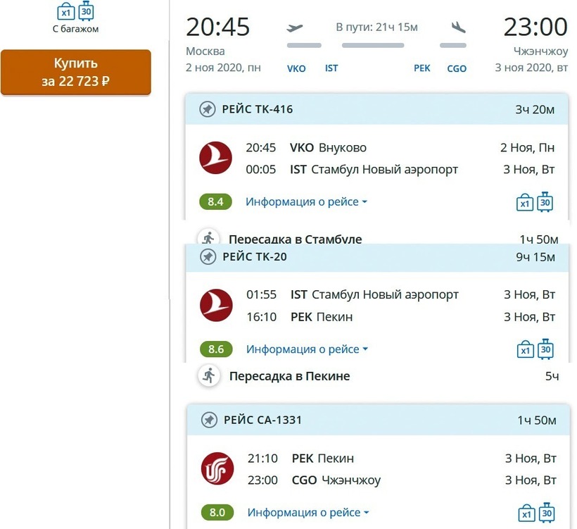Если найти недорогие авиабилеты на упомянутые выше рейсы не удается, могу порекомендовать перелеты с двумя пересадками. Например, преодолеть путь получится за 21 час с Turkish Airlines и Air China (с самостоятельными стыковками в Стамбуле в 2 ч. и Пекине в 5 ч.). Полет довольно дешевый — с багажом стоит от 23000 ₽.