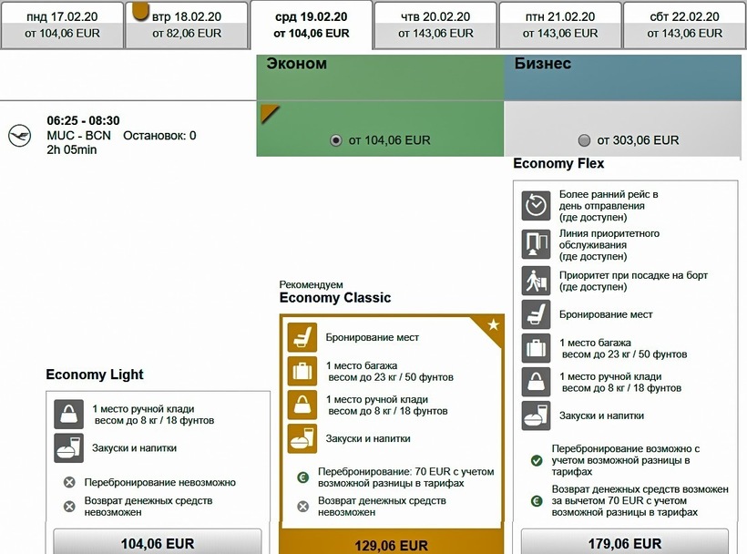 Lufthansa (LH 1808) Airbus A320 | 06:20 Мюнхен (MUC) | 2 ч. 05 мин | 08:25 Барселона (BCN) | 6 марта |