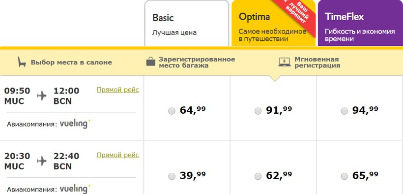 Vueling airlines (VY 1813) Airbus А321 | 09:55 Мюнхен (MUC) | 2 ч. 10 мин | 12:05 Барселона (BCN) | 18, 25 ноября |