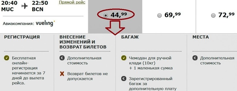Указанные цены действительны почти на протяжении целого года, но за 9–10 месяцев до даты вылета можно найти авиабилеты с багажом всего за 3500 ₽. Сэкономить с испанским перевозчиком получится у любителей путешествовать налегке — стоимость авиаперелета без багажа ниже на 1500–2000 ₽ в одну сторону. К преимуществам Vueling могу отнести то, что допустимый вес ручной клади у этого оператора немного больше, чем у Lufthansa — на борт авиалайнера разрешено взять чемодан до 10 кг. Кроме того, в отличие от вышеупомянутого перевозчика, у Vueling по минимальному тарифу Basic билеты изменяемые (но невозвратные).