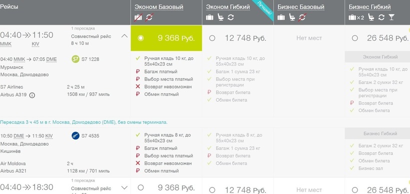 В бизнес-класс авиакомпания предлагает два тарифа с разным набором опций. Цены за пару дней стартуют с 99000 рублей. Отличительная особенность билетной политики перевозчика заключается в том, что все тарифы доступны в любое время. Объясню: раньше накануне вылета можно было купить, как правило, только дорогие тарифы эконома или бизнес-класса. Получалось, что людям, которым не нужны были дополнительные опции, приходилось переплачивать за более дорогой класс бронирования. Сегодня все тарифы доступны как за пару месяцев до вылета лайнера, так и за день до его отбытия. У S7 есть совместный рейс с Air Moldova. Его продолжительность — 8 часов. Стыковка в московском аэропорту Домодедово займет 3,5 часа. Билеты только туда за неделю — от 9300 рублей. Получается примерно на 20% дешевле, чем у «Аэрофлота». В экономклассе доступно два тарифа — «Базовый» и «Гибкий». Первый рекомендую брать, если летите ненадолго и налегке. Включена только ручная кладь. Второй тариф позволяет уже взять багаж.