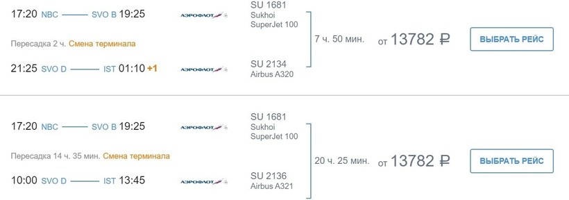 Если нет прямых рейсов по нужному мне маршруту, как правило, я предпочитаю рейсы с одной стыковкой. Для полета в Стамбул выбрала ведущего российского авиаперевозчика «Аэрофлот». У компании много вариантов перелетов, можно выбрать удобное время отправления/прибытия. Расписание стабильное — транзитные рейсы доступны ежедневно. Плюс цены на билеты приемлемые, и есть возможность получить неплохую скидку за единовременную покупку билетов туда-обратно.