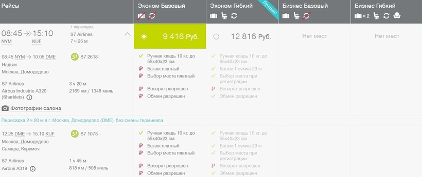 Попасть в Самару без пересадок у вас не получится — прямого авиасообщения между городами нет. Транзитный авиарейс есть у одной из самых крупных авиакомпаний РФ — S7. Продолжительность перелета со стыковкой в московском аэропорту Домодедово — 7,5 ч. Из этого времени на пересадку уйдет 2,5 часа. Смена терминала не требуется. Багаж будет зарегистрирован до конечного пункта еще в воздушной гавани Надыма. Авиаперелеты выполняются на Airbus A320 Neo и Airbus A319. Если летите в Самару ненадолго и без громоздких чемоданов, берите самый дешевый тариф экономкласса — «Базовый». Цена билета только туда — 9400 рублей (за неделю).