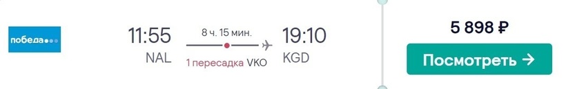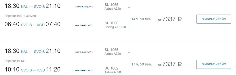 Один из ведущих российских авиаперевозчиков, авиакомпания «Аэрофлот», ежедневно предлагает два транзитных перелета по маршруту Нальчик — Москва — Калининград. Вылет вечером. Продолжительность первого авиаперелета 14 часов, второго — 18 часов. Соответственно на стыковки в московском аэропорту Шереметьево отводится 9,5 и 13 часов.