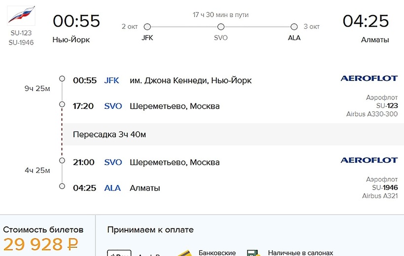 В зависимости от месяца, минимальная стоимость билета на самолет Нью-Йорк — Алматы в одну сторону («туда») колеблется от 21 613 (в ноябре) до 51 541 рубль (в июле) , максимальная может доходить до 71 968 рублей, а в среднем купить билет можно за 35 307 – 39 023 рубля.