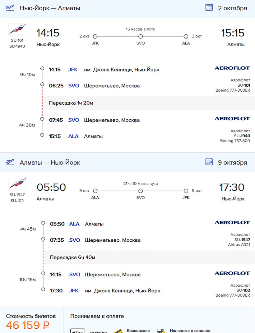 Прямого межконтинентального перелета из США в Алматы нет. С пересадками по маршруту летают самолеты 10–20 компаний. Наиболее интересные рейсы (по сочетанию цена/пересадка/багаж) предлагают перевозчики: