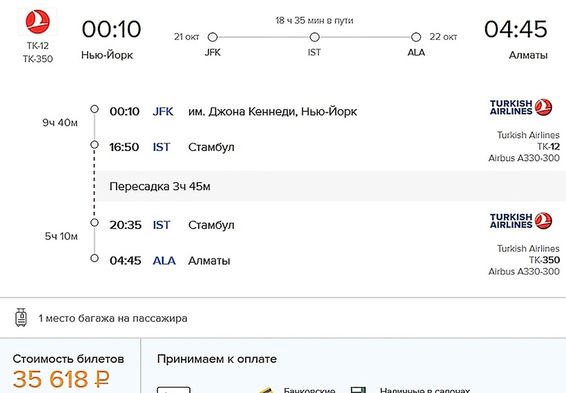 Авиакомпания Turkish Airlines летает в Алматы ежедневно со стыковкой в Стамбуле (Новый аэропорт Стамбула). В день выполняется 2–4 рейса, можно найти пересадку от 3,5 часа. Нормы провоза вещей, такие же удобные, как у МАУ: ручная кладь 8 кг и 2 места по 23 кг. Что касательно цен: с осени до середины весны стоимость — от 35 тысяч ₽, если бронировать хотя бы за 1 месяц.