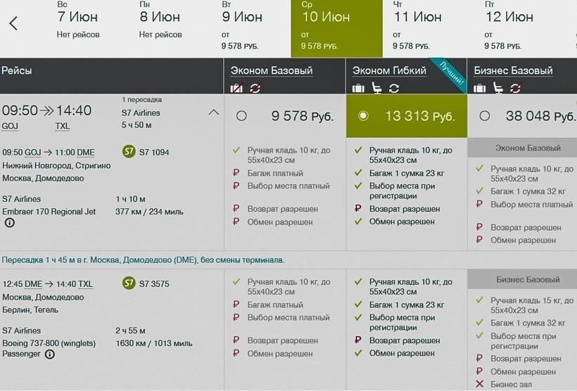Указанная стоимость у перевозчика актуальна на протяжении почти всего года, только возрастает на 2000 ₽ в одну сторону на вылеты на новогодние и рождественские праздники. S7 Airlines незначительно уступает предыдущей российской авиакомпании в расписании полетов — ежедневно выполняется по одному утреннему рейсу через Домодедово. С учетом пересадки в 1 ч. 45 минут путешествие занимает 6 часов. Но стоимость билетов у S7 ниже аэрофлотовской: перелет только туда с багажом обойдется от 13500 ₽, если забронировать сразу и в обратном направлении — от 19500 ₽. В бизнес-классе долететь с S7 можно только из Москвы в Берлин, а до российской столицы перевозчик предлагает только полет в классе эконом. Такое авиапутешествие обойдется от 38000 ₽.