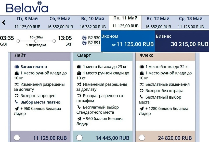 Выбрав путешествие с S7 Airlines, можно также сэкономить на багаже — билет исключительно с ручной кладью дешевле на 4000 ₽. Цены распространяются практически на все вылеты в году, а на новогодние праздники стоимость увеличивается значительнее, чем у «Аэрофлота» — на 11000 ₽ в одну сторону. Поэтому на этот период советую бронировать места на борту самолета заранее, или лететь с другим авиаоператором. С Belavia можно преодолеть маршрут только по понедельникам, средам и пятницам через Минск. Со стыковкой длительностью 7 часов путешествие в общем займет 11 ч. Пересадка утренняя, и вместо ожидания в аэропорту могу посоветовать отправиться в Верхний город или подняться на обзорную площадку Национальной библиотеки. Полет с белорусским оператором рекомендую как альтернативу путешествия на крыльях «Аэрофлота», потому что авиабилеты у Belavia дешевле: только туда можно купить за 14500 ₽ (с багажом), в обе стороны — от 31000 ₽. Бизнес-класс — от 30000 ₽.