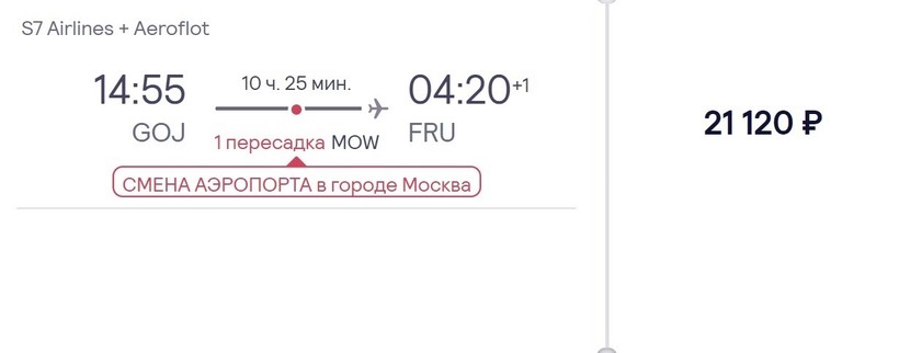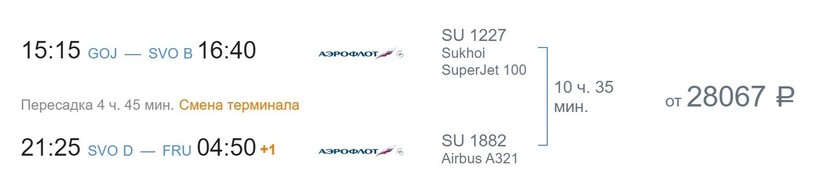 В столицу Киргизии из Нижнего Новгорода долететь можно только транзитом, прямого авиасообщения между населенными пунктами нет. За 10,5 ч. до места назначения можно добраться на лайнерах авиакомпаний S7 и «Аэрофлот». Стыковка в Москве продлится около 5 ч. Она самостоятельная, со сменой воздушной гавани (из Домодедово нужно попасть в Шереметьево). Учитывая, что времени на пересадку отводится немного, советую воспользоваться услугами такси, чтобы добраться из одного аэропорта в другой. Стоимость авиабилетов только туда за несколько недель до вылета — от 21200 рублей.