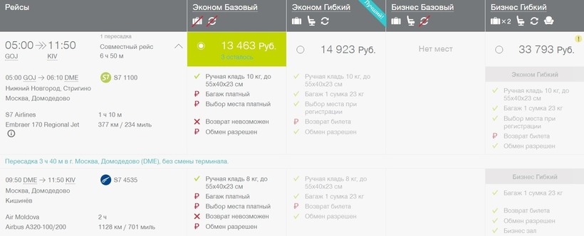 Кстати, билеты на оба рейса можете купить через российского авиаоператора, между компаниями заключено код-шеринговое соглашение. Что касается тарифных планов, то у S7 есть и эконом, и бизнес-класс. Я летаю только экономическим классом, могу порекомендовать выбрать тариф «Гибкий». Он оптимальный по цене и включенным опциям. По его условиям можно взять ручную кладь (до 10 кг) и багаж (до 23 кг). Возврат/обмен авиабилета разрешен только со штрафом.