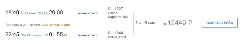 Также по маршруту Нижний Новгород — Москва — Кишинев осуществляет транзитные рейсы самая крупная российская авиакомпания «Аэрофлот». Продолжительность самого оперативного перелета до столицы Молдовы составляет 7 часов, стыковка в Шереметьево — около 3 часов. Потребуется смена терминала. За перелет в одну сторону отдадите минимум 12500 рублей (за три месяца).