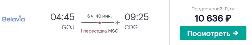 Советую лететь во французскую столицу с «Белавиа». Я выбрала эту а/к по параметрам стоимость авиабилетов/время в дороге. Проездные почти в два раза дешевле, чем у «Аэрофлота». Это максимально быстрый способ добраться до столицы Франции из Нижнего Новгорода (6,5 часов, и вы на месте). Но у перевозчика не совсем удобное время вылета — около пяти утра. Зато прибытие в Париж также утром. Помните, разница во времени между городами два часа. Также, выбрав данный вариант, нужно будет подстраиваться под расписание а/к. Напомню, что рейсы доступны только два раза в неделю.