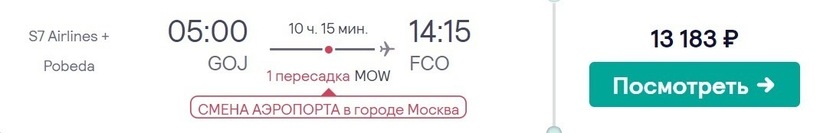 Потратив 13100 рублей (цены стабильны за месяц и более до вылета), до места назначения долетите с S7 и «Победой». Данный вариант перелета доступен в так называемый высокий сезон (с июня по конец октября), когда в Вечном городе больше всего туристов. Минус этого варианта авиапутешествия заключается в том, что в столице РФ придется сменить воздушную гавань. Самолет S7 доставит в Домодедово, следующий вылет с лоукостером из Внуково. На стыковку дается 5,5 ч. Удобнее всего из одного аэропорта в другой ехать на такси. Всего авиаперелет займет 10,5 ч.