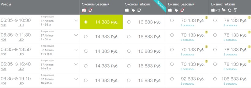 Я всегда летаю с S7. Есть удобный рейс, который отправляется из Новокузнецка рано утром. Стыковка в Москве будет минимальная, полтора часа. Даже при незаблаговременной покупке билеты будут стоить дешевле аэрофлотовских, есть гибкая система тарифов, можно расплачиваться милями. Но я беру билеты примерно за полгода, тогда можно улететь за 14000 рублей. Кроме того, если выбирать стыковочные рейсы с S7, не придется менять терминал (самолеты «Аэрофлота» приземляются в Шереметьево в терминал D, а самолеты в Питер вылетают из терминала B). Плюс время пересадки у S7 составляет всего 1,5 часа против 2,5 у «Аэрофлота».