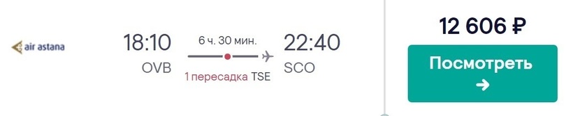 Более дешевый и быстрый вариант — совершить авиапутешествие с «Эйр Астана». Дорога до конечного пункта займет 6,5 ч. Стыковка в Нурсултане продлится 2 часа. Полетите по единому билету, багаж до конечного пункта будет зарегистрирован еще в Новосибирске (аэропорт Толмачево). Казахский перевозчик предлагает три тарифа экономического класса обслуживания.