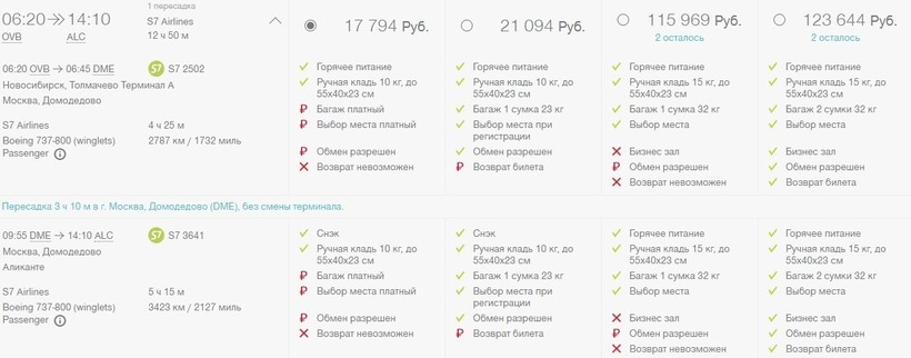 Добраться до Аликанте можно на самолетах авиакомпании S7 с пересадкой в Москве. Продолжительность одного из самых удобных транзитных перелетов, которые предлагает авиакомпания, составляет 13 часов. Из этого времени на стыковку в столице РФ уйдет 3 часа. В аэропорту Домодедово за это время вам нужно пройти предполетные процедуры: паспортный контроль, таможенный досмотр. Повторно регистрироваться на рейс нет необходимости — полетите по единому билету.
