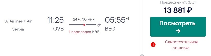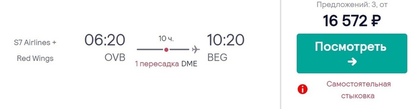 Общее время в пути — 10 часов. Пересадка также в Москве, но в аэропорту Домодедово. На нее дается 2,5 часа. Багаж не будет зарегистрирован до конечного пункта, так что в Домодедово его нужно забрать и снова сдать. Если готовы потратить сутки на дорогу, то еще дешевле можно долететь с S7 и Air Serbia через Краснодар (аэропорт Пашковский). Билеты за неделю — от 13900 рублей.