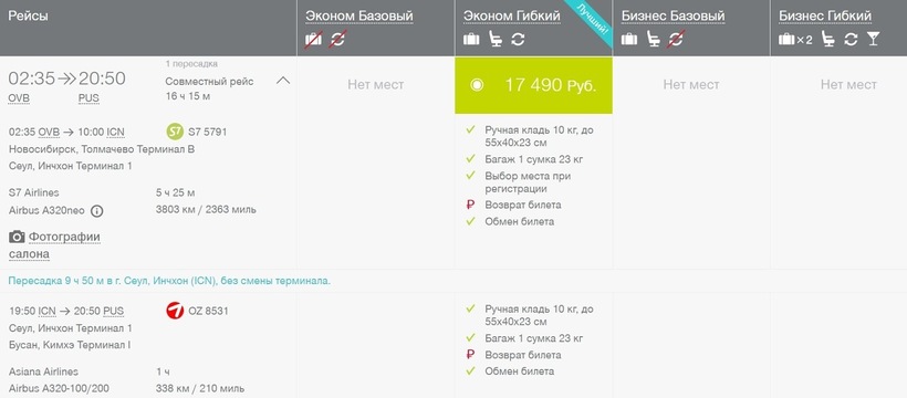 Несколько раз летала по этому маршруту с S7 Airlines и Asiana Airlines. Выбирала эти авиакомпании, потому что именно они предлагают максимально низкую цену на билеты. Вдобавок у перевозчиков есть договоренность о пересадке, и багаж можно зарегистрировать до конечного пункта в аэропорту вылета. Согласно код-шериногвому соглашению проездные на оба рейса можно сразу купить на сайте S7 Airlines.