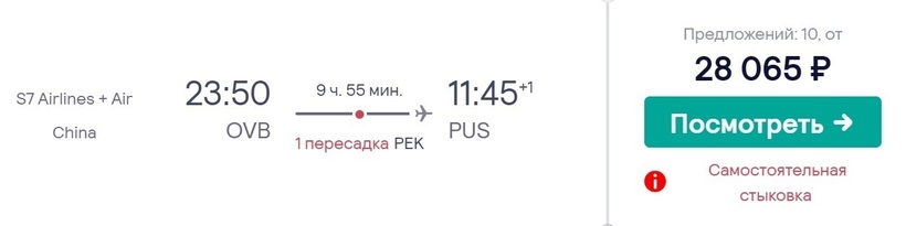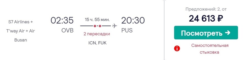 Такой вариант перелета подразумевает самостоятельную стыковку — в аэропорту пересадки нужно забрать багаж и зарегистрироваться на следующий рейс. С двумя пересадками можно добраться до Пусана за 16 часов и 24600 рублей (если бронировать за три месяца). Перевозчики: S7 Airlines, T'way Air и Air Busan. Такой вариант подойдет, если на нужные даты не найдете дешевых билетов с одной стыковкой. Первая пересадка в Сеуле (Инчхон) — 3,5 ч., вторая в Фукуоке — 4,5 ч.