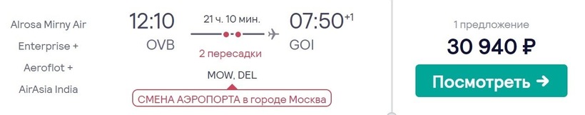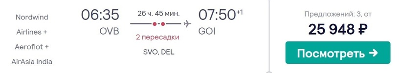 Предложить прямой перелет по этому маршруту не может ни один авиаперевозчик. Добраться до Гоа можно транзитом. Улетают самолеты из единственного международного аэропорта столицы Сибири — Толмачёво. До него ходит маршрутное такси № 312. Расписание вполне удобное — транспорт курсирует часто. На маршрутку можете сесть на железнодорожном вокзале. За сутки с небольшим из Новосибирска на этот индийский курорт попадете с Nordwind Airlines, «Аэрофлотом» и AirAsia India. Первая стыковка в Москве — в аэропорту Шереметьево. Это большая, современная воздушная гавань, и тут есть все необходимое, чтобы комфортно провести время, ожидая следующий вылет (магазины, кафе, бесплатный Wi-Fi). На пересадку отводится 12 часов. Все это время можно не сидеть в воздушной гавани, а съездить в центр столицы — прогуляться по Старому Арбату или Красной площади. Туда-обратно можете добраться на аэроэкспрессе. В общем на дорогу уйдет 1,5 часа. Вторая стыковка в Дели. Она займет два часа. Теперь про стоимость перелета. Билеты в одну сторону обойдутся в 26000 рублей (минимальная цена), если купить их за несколько недель. Если забронируете за месяц — сэкономите 1000 рублей.