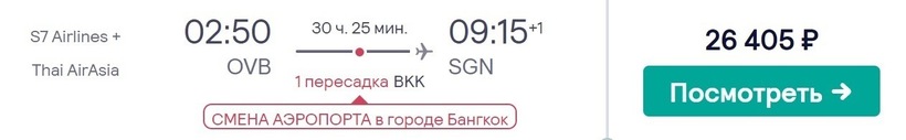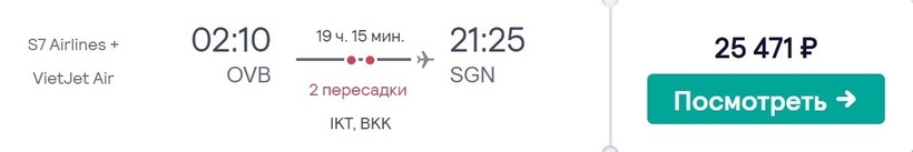 Билеты по приемлемым ценам на рейсы с двумя пересадками за месяц и более до вылета найти вполне реально. Этот вариант советую рассматривать только в том случае, если на нужные даты нет подходящих перелетов с одной стыковкой. Один из самых оптимальных вариантов — авиапутешествие с S7 и VietJet Air. Цены на билеты — от 25400 рублей (за месяц и более). Дорога до конечного пункта займет 19,5 ч. Стыковки в Иркутске и Бангкоке, на них уйдет 9 часов.