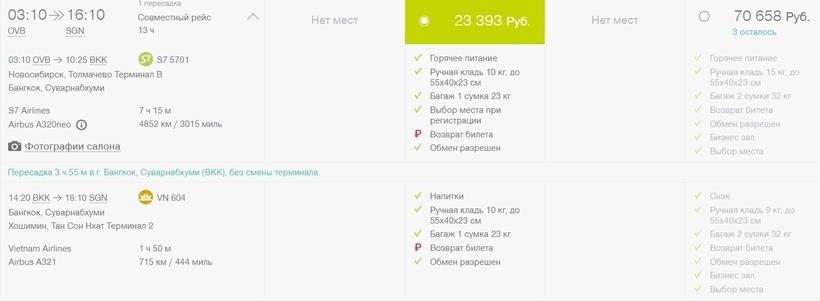 Если возможность добраться в нужное место прямым самолетом отсутствует, я стараюсь летать с одной стыковкой и проводить в пути минимальное количество времени. Для полета в Хошимин выбрала S7 и Vietnam Airlines (перелет со стыковкой в столице Таиланда). Причина — авиаоператоры предлагают один из максимально быстрых транзитных рейсов, и стоимость билетов вполне приемлемая (от 23400 рублей за месяц).