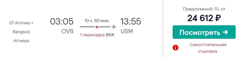 Прямые рейсы на остров Самуи из Новосибирска не выполняются — летаю транзитом. А/к S7 и Bangkok Airways доставят вас до конечного пункта за 11 часов. Билет накануне вылета самолета — от 69000 рублей. За пару месяцев его купите за 24600 (обратный обойдется примерно в такую же сумму) — это в 2,5 раза дешевле.
