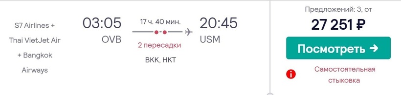 Не всегда удается найти дешевые билеты на нужные даты с одной пересадкой, тогда приходится путешествовать с двумя. Одним из самых оптимальных вариантов в таком случае будет лететь с S7, Thai VietJet Air и Bangkok Airways. Дорога займет 17,5 ч. Авиабилеты за 2 месяца до полета — от 27200 рублей.