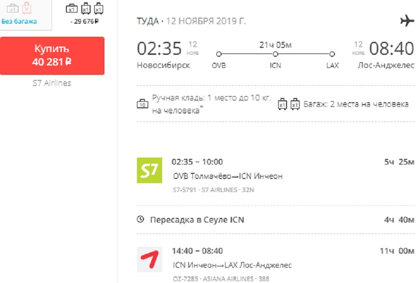 Попасть из Новосибирска в Лос-Анджелес также можно с авиакомпаниями S7 Airlines и Asiana Airlines через Сеул. Расписание полетов у перевозчиков не могу назвать удобным, потому что преодолеть маршрут с этими операторами получится только по вторникам и субботам. Рейс ночной с самостоятельной стыковкой. Это значит, что в аэропорту пересадки (после первого отрезка пути) вам придется забрать багаж, а затем пройти регистрацию на второй авиарейс.
