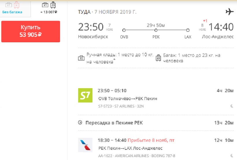 S7 и American Airlines через Пекин. Общее время путешествия составит 30 ч, а билет только туда будет стоить от 54000 ₽. Поскольку пересадка в китайской столице длится 13,5 часа, такой рейс я рекомендую тем, кто хочет совместить полет в Лос-Анджелес с посещением Пекина. Например, посмотреть Запретный город или отправиться на Великую Китайскую стену.