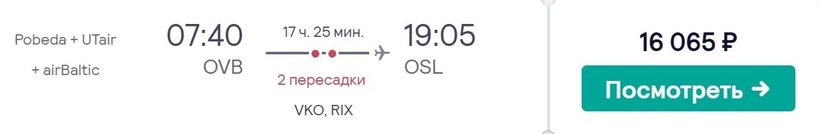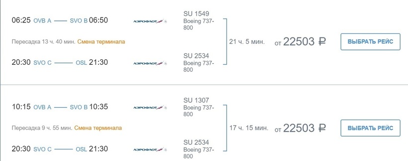 Авиакомпания «Аэрофлот» предлагает регулярные круглогодичные транзитные рейсы по маршруту Новосибирск — Москва — Осло. Количество ежедневных перелетов — от пяти до семи (расписание нестабильное). Минимальное время в пути — 9,5 ч., максимальное — 1 сутки и 7 часов. Отправление утром, днем, вечером. Продолжительность стыковок — от 2,5 часов до суток. Пересадка всегда проходит в международном аэропорту Шереметьево — это хаб авиаоператора в столице РФ. Стоимость билетов одинакова как за неделю, так и за полгода до вылета и составляет минимум 22500 рублей. Если летите в Осло в праздничные дни, то советую покупать авиабилеты заранее, чтобы взять их по минимальной цене.