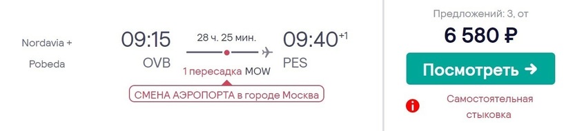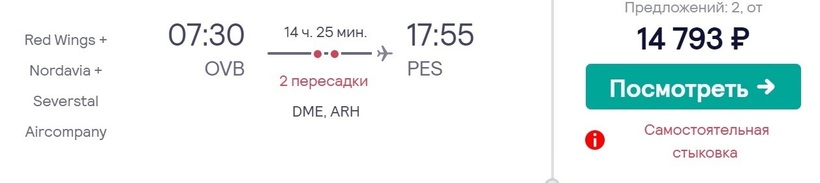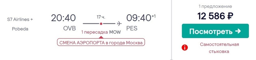 Прямыми авиаперевозками по этому маршруту не занимается ни одна авиакомпания. Попасть из Новосибирска в Петрозаводск можно только транзитными рейсами. Расскажу про самые актуальные варианты. Один из самых дешевых перелетов предлагают «СмартАвиа» (бывшая «Нордавиа») и «Победа». Билеты только туда за пару недель можно купить за 6500 рублей. Если бронировать за месяц, то можно сэкономить 5–10 %. На дорогу уйдет немногим более суток. Стыковка длится 22,5 часа. Сначала прилетите в Домодедово, следующий вылет из Внуково.
