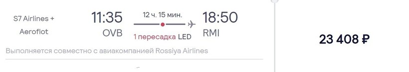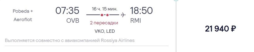 Альтернативой прямому рейсу может служить перелет с пересадками от авиакомпании Аэрофлот - Российские авиалинии. Минимальная стоимость билета составляет 33 978 рублей.