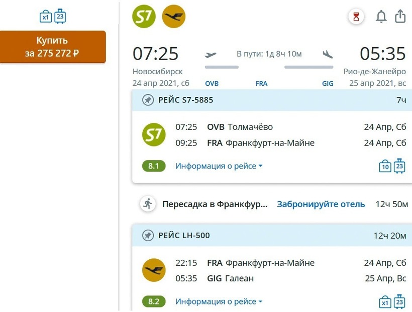 Прямые авиарейсы в бразильский Рио-де-Жанейро из российского Новосибирска не выполняются. Транзитное сообщение между городами также нельзя назвать хорошо развитым, потому что авиаперелеты с одной пересадкой сезонные, и осуществляют их только S7 Airlines и Lufthansa. Расписание рейсов у российской и немецкой авиакомпаний не самое удобное: самолеты летают по направлению только с конца апреля по конец октября всего один раз в неделю — по субботам. С пересадкой во Франкфурте в 13 часов авиапутешествие занимает 32 часа. Стыковка дневная, во время которой советую, например, прогуляться по площади Ремер или по району Заксенхаузен, посетить Дом Гёте или Пальмовый сад. Этот вариант полета могу порекомендовать лишь в исключительных случаях, потому что он очень дорогой: туда обойдется от 275500 ₽ (с багажом), в обе стороны — от 535000 ₽. Бизнес-класс — от 598000 ₽. Цены актуальны в течение всего сезона.