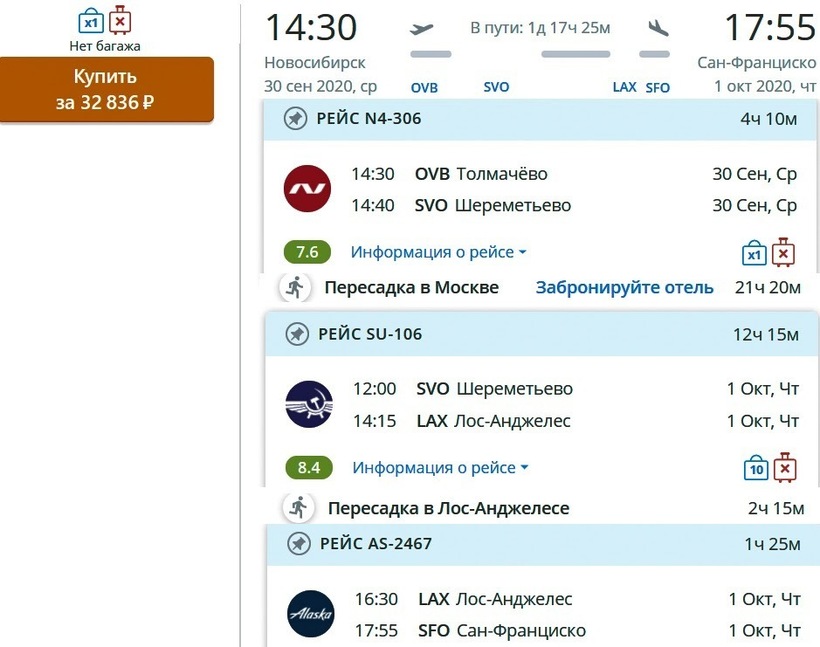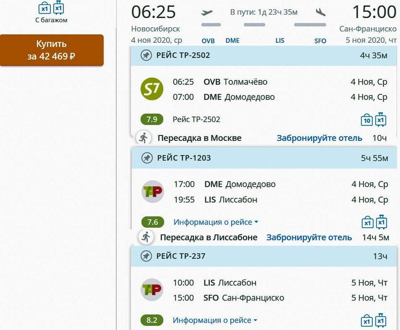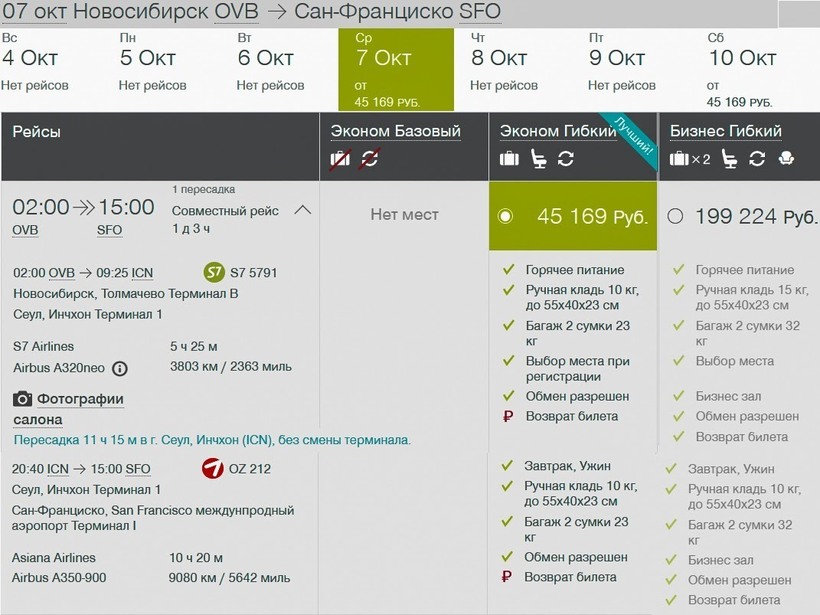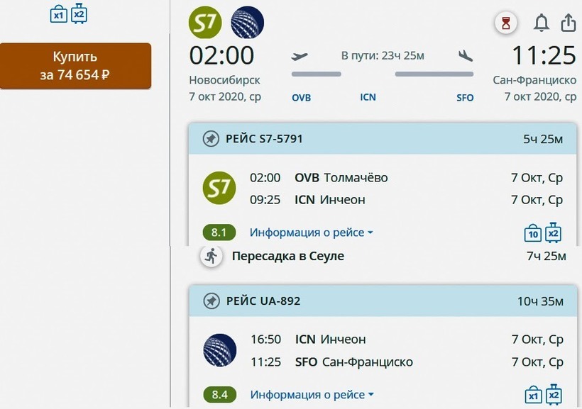и перелет с S7 и Asiana или S7 и United Airlines. Зато