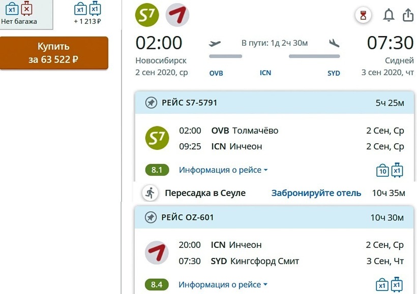Новосибирск и Сидней разделяет довольно большое расстояние, и прямые рейсы по маршруту не выполняются. Преодолеть путь можно только транзитом, перелеты с одной пересадкой круглый год предлагают только S7 Airlines и Asiana Airlines. Лайнеры российской и южнокорейской компаний летают по направлению с апреля по конец октября по средам и субботам, в осенне-зимнее время — по вторникам и субботам. Со стыковкой в Сеуле в 10–14 ч. путешествие занимает 25,5–30 ч. Пересадка дневная, поэтому рекомендую в столице Кореи отправиться, например, в храм Бонгеунса или дворцовый комплекс Кёнбоккун, а также прогуляться по торговому кварталу Мёндон. На вылеты в осенне-зимний период билеты у операторов можно купить туда за 63500–69500 ₽ (с багажом), в обе стороны авиаперелет обойдется от 109500 ₽. С ручной кладью путешествие дешевле на 1500–3500 ₽. Стоимость полета в бизнес-классе — от 151000 ₽.